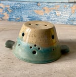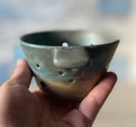 A cute little bowl to store and/or drain your berries. Made with a heavily speckled stoneware clay. Partially satin partially gloss glaze. The satin glaze is a variegated blue grey colour, almost giving a burnt edge effect.