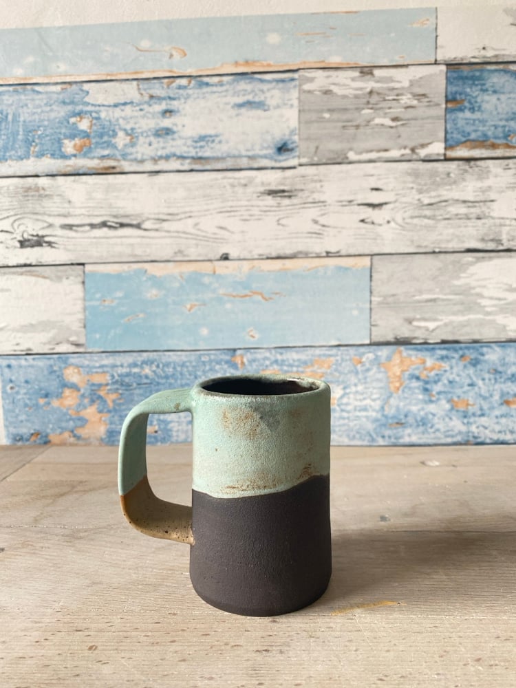The top half of the mug and handle is dipped in a subtle, satin duck egg glaze. The ridged handle is made with a speckled, natural clay.