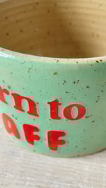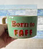 A vibrant turquoise/green wash sits under "Born to faff" in a cherry red font