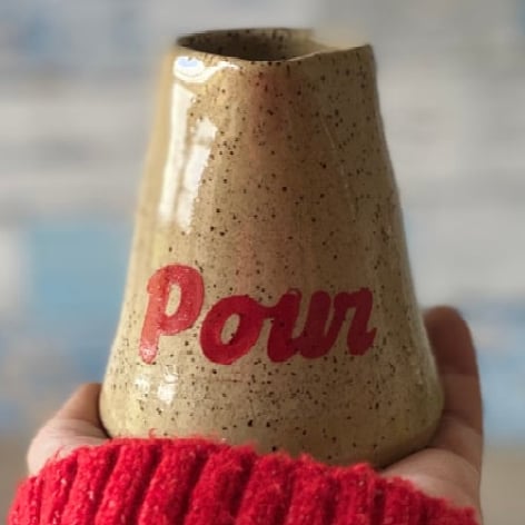 Hand thrown with my fave speckled clay. Transparent wash of glaze and “Pour” instructions in cherry red.